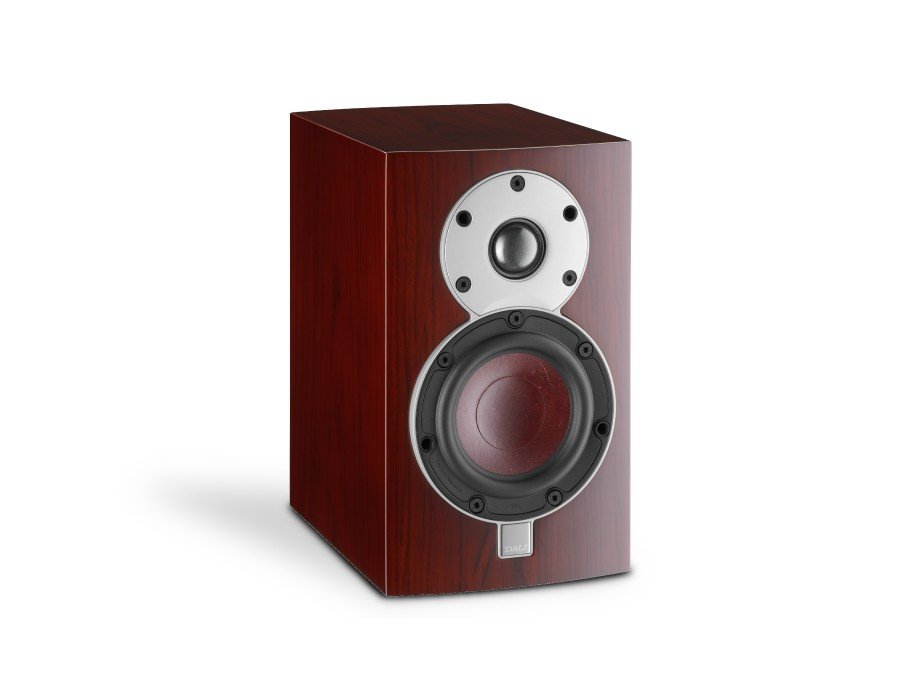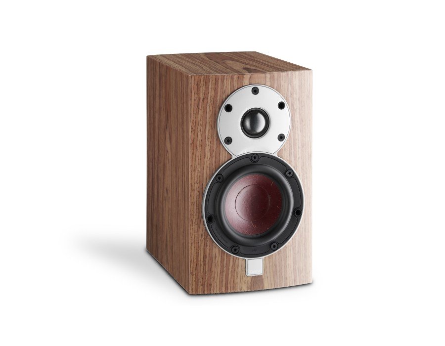 The 4.5” woofer is airflow optimized to achieve the best possible coupling between the wood fiber cone and the real wood veneer cabinet. Even the woofer cut-out in the cabinet is made larger than normal to optimise openness and dynamic response. The oversized 28 mm/1.1” soft dome tweeter is able to start and stop with great speed and precision due to the very low mass of the dome assembly and a powerful motor system (the dome is approximately 30% lighter than comparable standard domes and the magnet in the motor system is made of the strongest neodymium material available). The DALI designed drivers, sturdy binding posts and high quality crossover is the key to achieving extraordinary performance from such a compact loudspeaker.