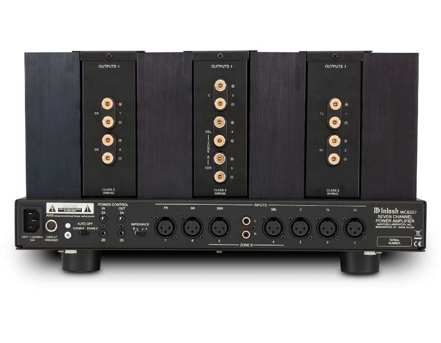 The McIntosh exclusive Dynamic Power Manager® (DPM) technology enables the MC8207 to deliver its full power into both 4 and 8 ohm speakers, meaning it’s compatible with a wide variety of home theater speakers – unlike many other high current amplifiers. Just like our other home theater amplifiers, the MC8207 does not need cooling fans, eliminating fan noise that can interfere with the delicate nuances of a movie’s soundtrack. Power Guard® will prevent potential speaker damage caused by clipping and over-driving of the amplifier. Short-circuit protection is provided by Sentry Monitor™ that disengages the output stage before current exceeds safe operating levels and then resets automatically when operating conditions return to normal.