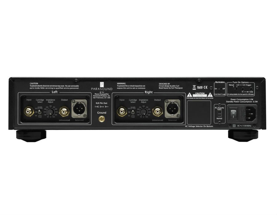 - Variable MC load adjust independent for each channel from 50-550 ohms with dual gang potentiometers specially made for Parasound by Vishay.